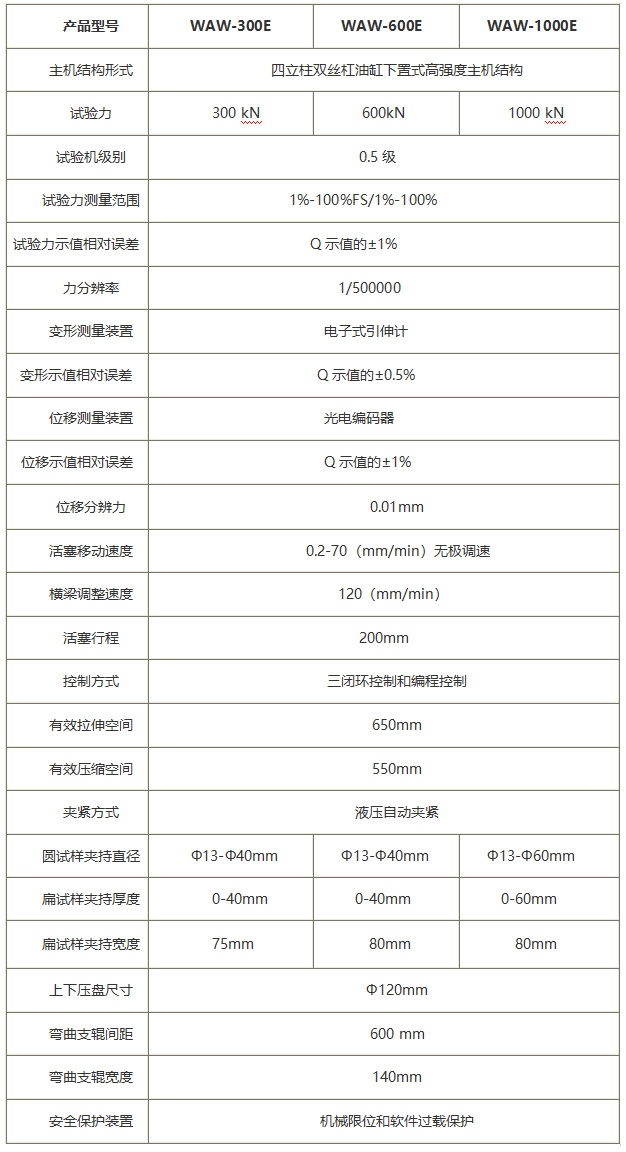 WAW-E系列微机控制电液伺服万能试验机主要用于金属材料的拉伸、压缩、弯曲等力学性能试验,增加简单的附件后可对水泥、混凝土、砖、瓦、橡胶及其制品进行检测。
